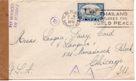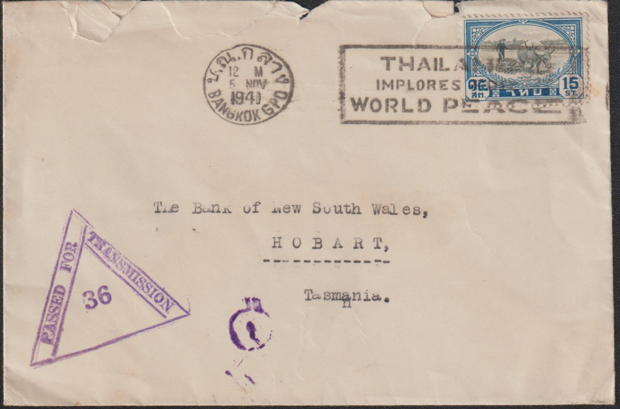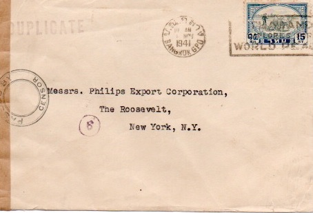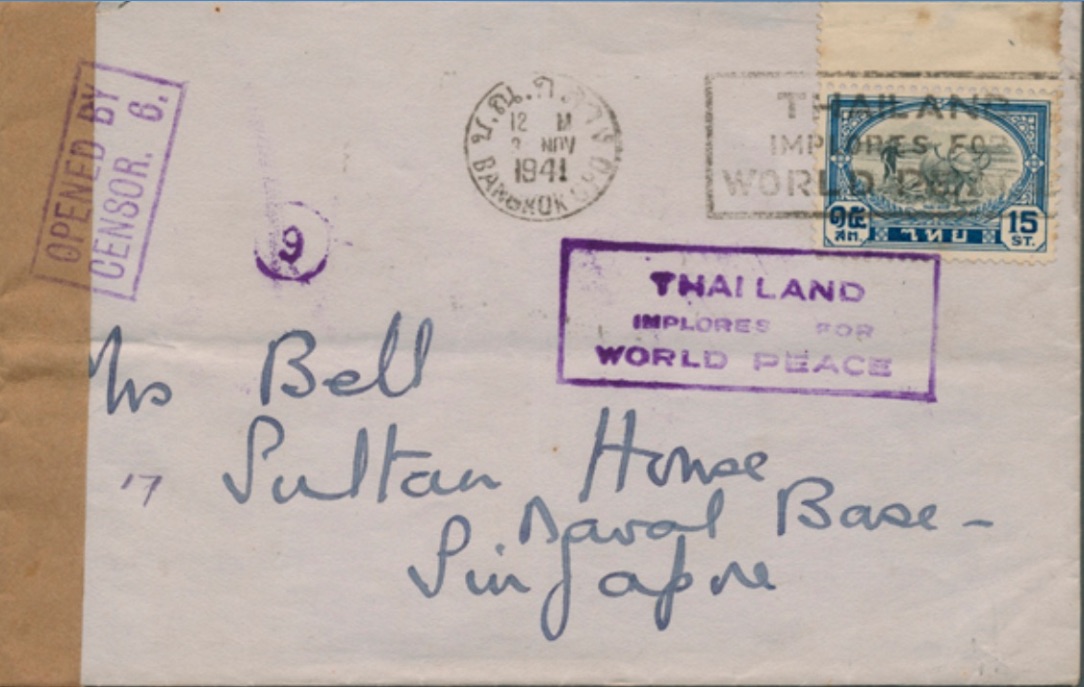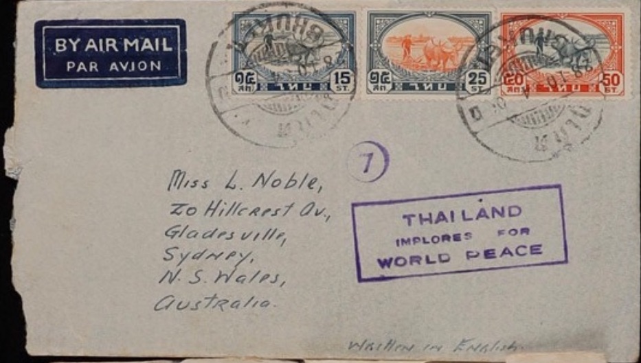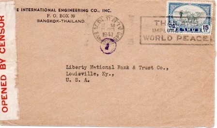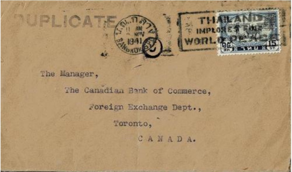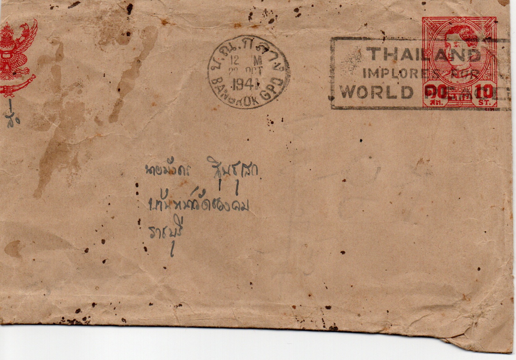 OCTOBER 1941: A mechanical postmark with flame "THAILAND / IMPLORES FOR / WORLD PEACE" is put into service in Bangkok, an ally of the Japanese, once again showing their duplicity two months before Pearl Harbour.