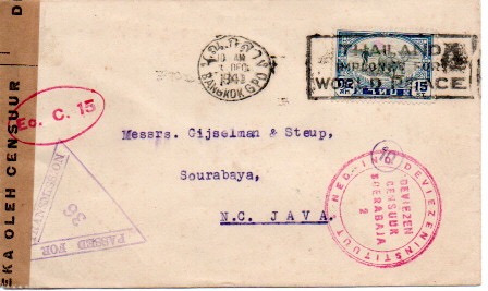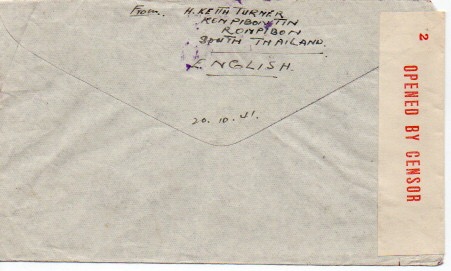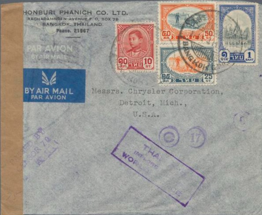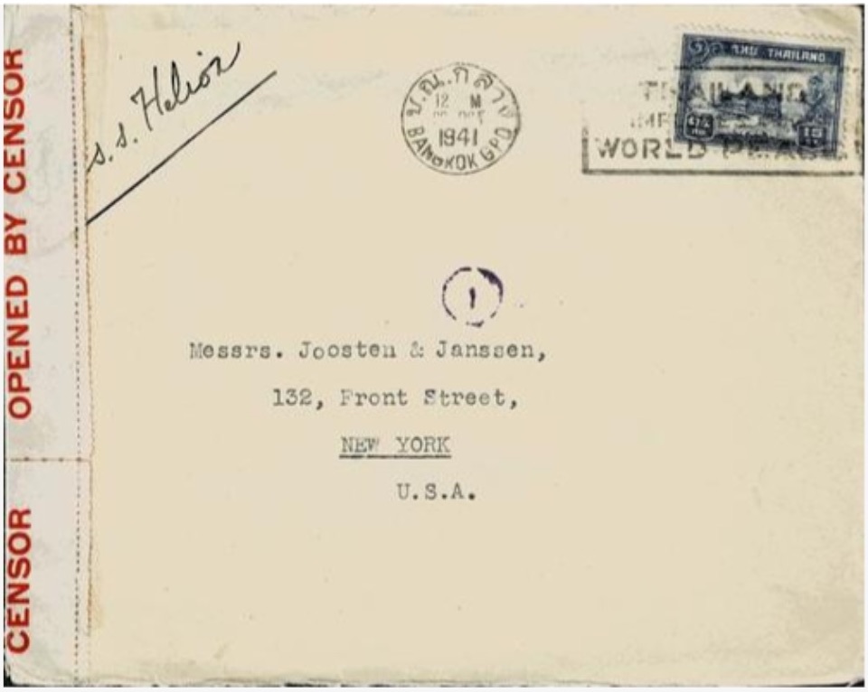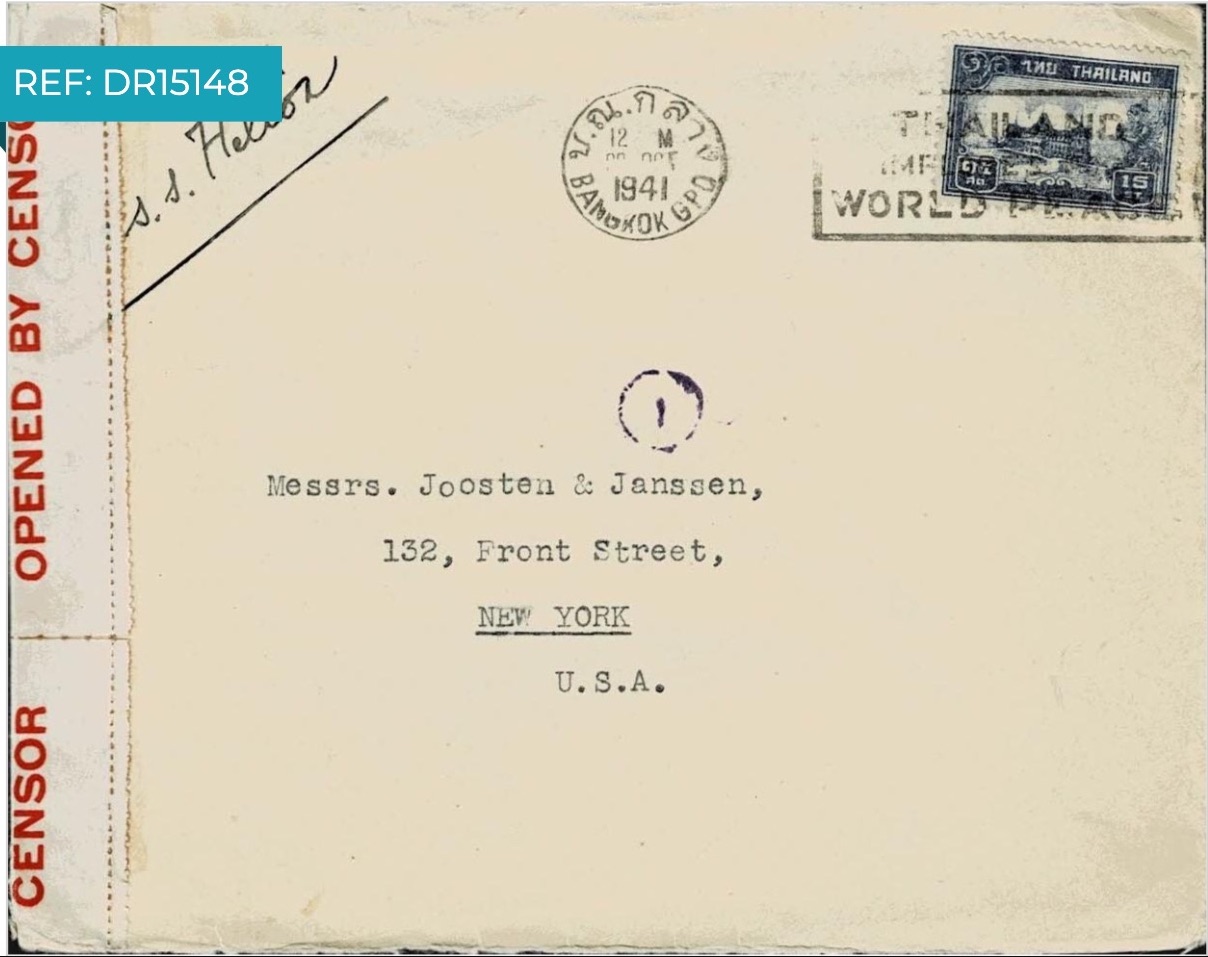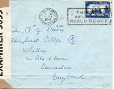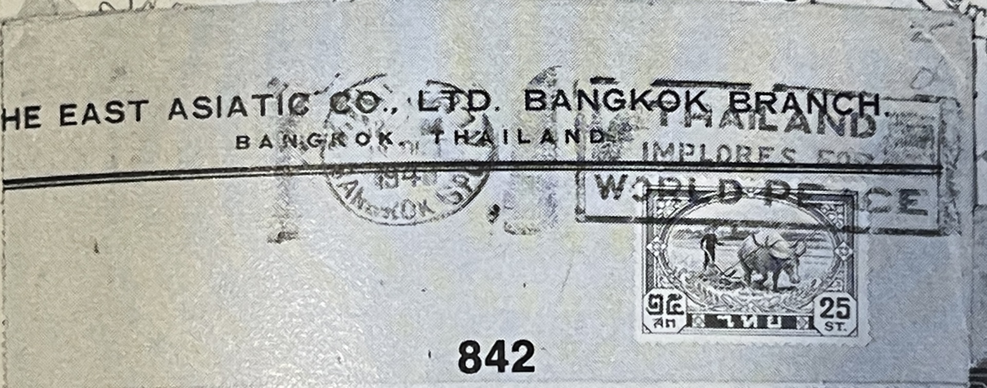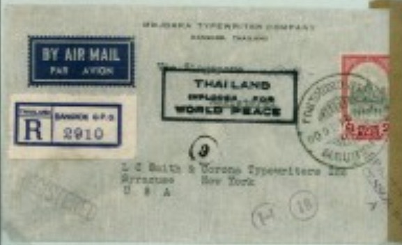 OCTOBER 1941: A mechanical postmark with flame "THAILAND / IMPLORES FOR / WORLD PEACE" is put into service in Bangkok, an ally of the Japanese, once again showing their duplicity two months before Pearl Harbour.